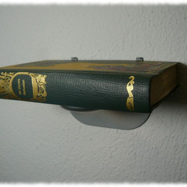 Material: Buch, gefertigt aus Karl Mays „Der blaurote Methusalem« von 1888, Edelstahl-Regalwinkel, Dreier-LED
